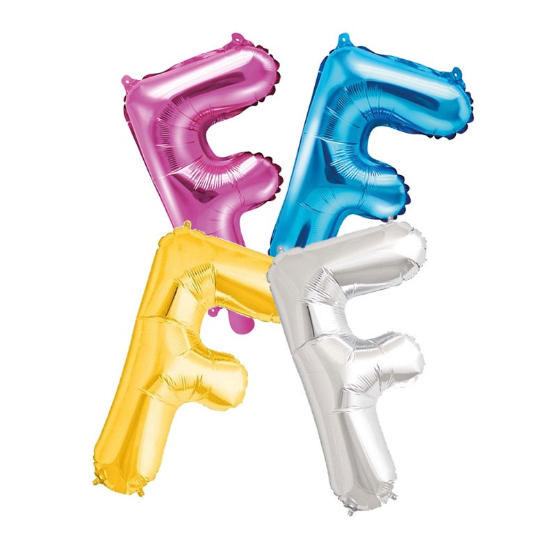 Les ofrecemos un globo con la letra F, ideal para felicitaciones originales y bonitas, o para otras funciones. Estos globos son muy monos para confeccionar nombres a través de la combinación de diferentes letras. En este caso el globo puede ser de color dorado o plateado metalizados. Al ser de 40 cm el globo no flotará, ya que se necesita un mínimo de 46cm para que floten. Son de material foil, y se sirven desinflados.
